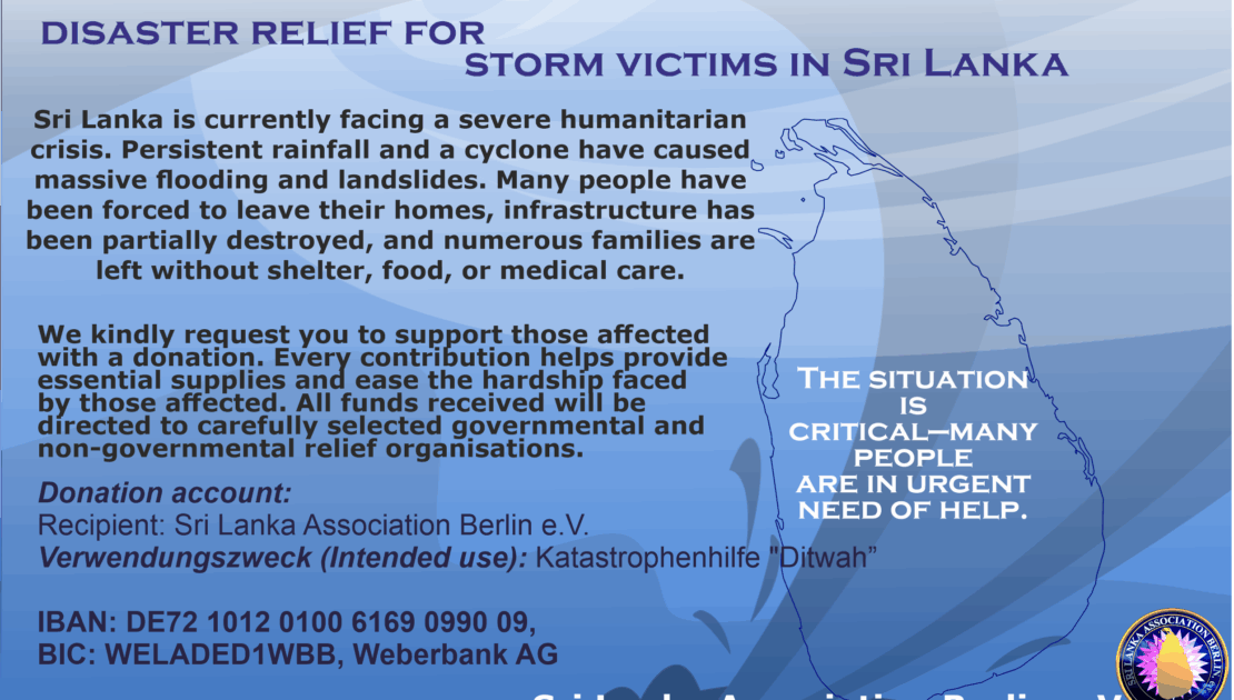In Sri Lanka herrscht aktuell eine schwere Notlage. Dauerregen und ein Zyklon haben Überschwemmungen und Erdrutsche verursacht. Viele Menschen mussten ihre Häuser verlassen und stehen ohne Unterkunft, Nahrung und medizinische Versorgung da.